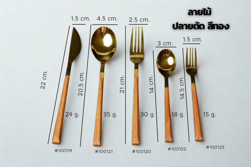| ช้อนโต๊ะ | #100111 | 20.5 | 4.5 | 35 | ด้ามไม้ ปลายแหลม สีทอง |